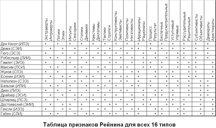 Суть концепции: два признака в сочетании дают третий; экстраверты * рационалы = динамики. Там, где существуют 4 дихотомии базиса Юнга, существуют и остальные 11.